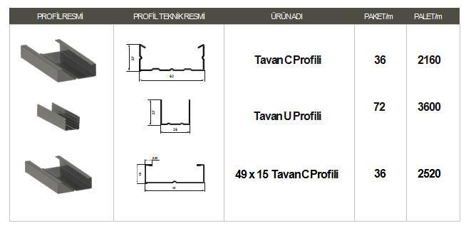 Alçı Levha Asma Tavan ve Bölme Duvar Sistemlerinde kullanılan profiller sıcak daldırma galvaniz çelik metal çerçeve bileşen profilleridir. Bu profillerin Asma Tavanda kullanılanlarına Tavan C ve Tavan U, bölme duvarda kullanılanlara ise Duvar C ve Duvar U profili ismi verilir. Standart 3 m olarak üretilir, proje detayına göre özel boy üretim de yapılabilir.